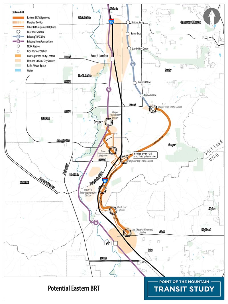 With the planning and alternatives analysis process completed, the Point of the Mountain Transit Study is moving into the initial stages of project development, which will include conceptual engineering and environmental documentation. UTA will again work together with the Utah Department of Transportation, Draper City, Lehi City, South Jordan City, Sandy City, Wasatch Front Regional Council, Mountainland Association of Governments, Salt Lake County, and Utah County to complete this phase of the project.